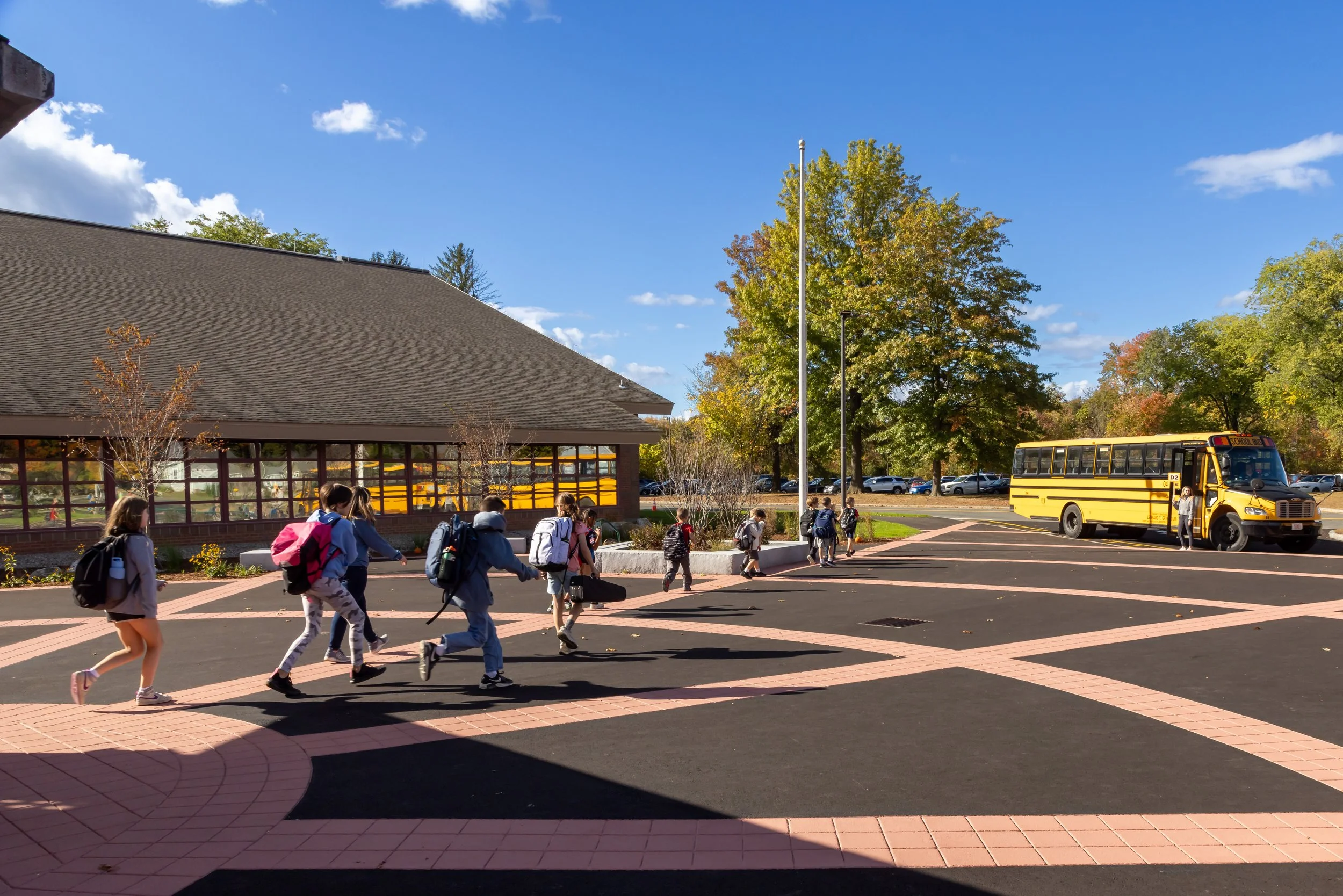 Deerfield Public Schools envisioned a new entrance plaza defined by radial lines emanating from the building entrance. In response to budget constraints, the project focused on repaving the existing, deteriorated asphalt plaza rather than undertaking a full reconstruction. The renewed surface features stamped and painted asphalt lines and arcs radiating from the entrance vestibule, establishing a strong visual identity and a clear sense of organization.