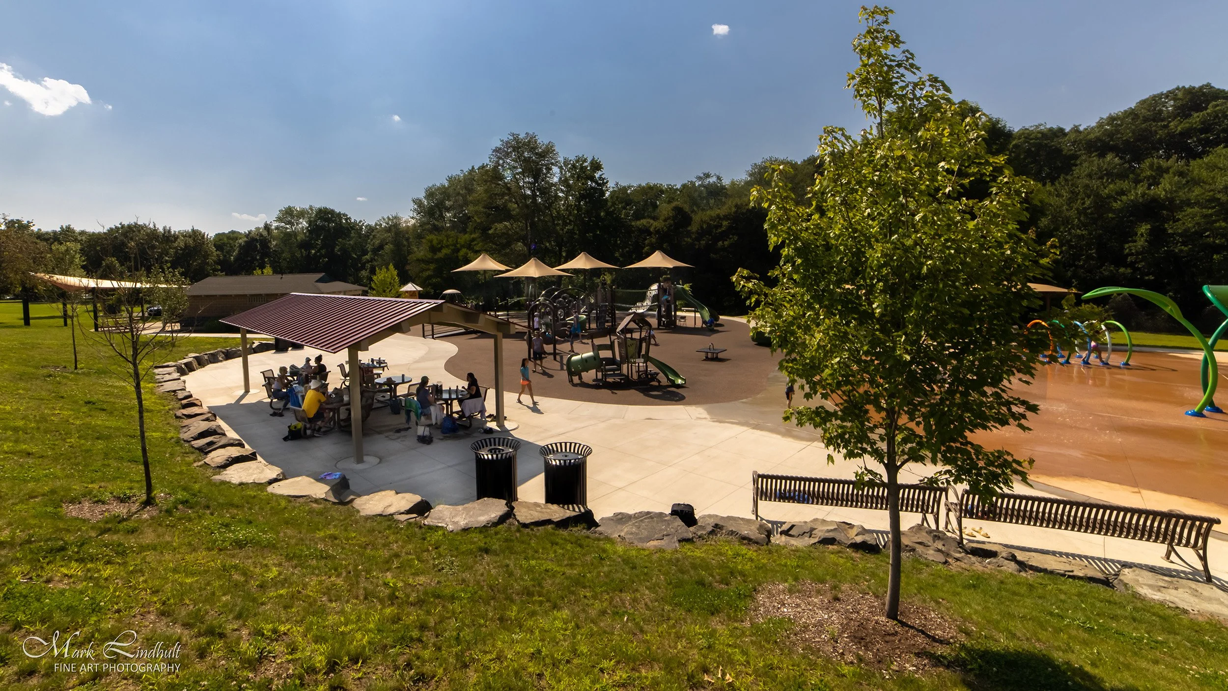 The project incorporates a new splashpad, with age-appropriate play equipment and water features grouped together. The playground and splashpad is fully accessible with rubberized surfacing. The park includes a custom shade sail structure and a new picnic pavilion just off of the play and splash pad areas, making it easy for families to watch and spend more time socializing. Stormwater gardens and perennials can be found around the periphery of the park.