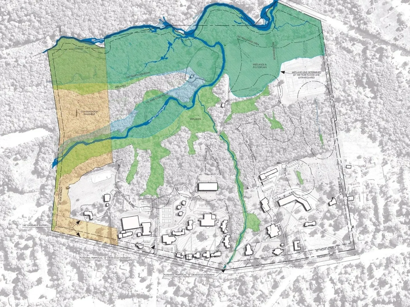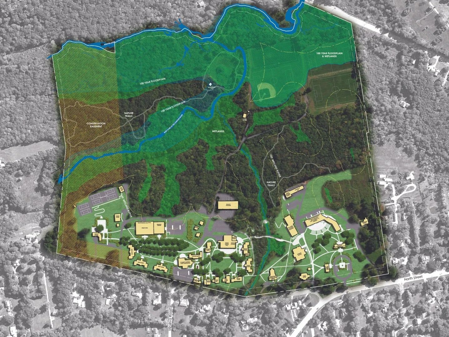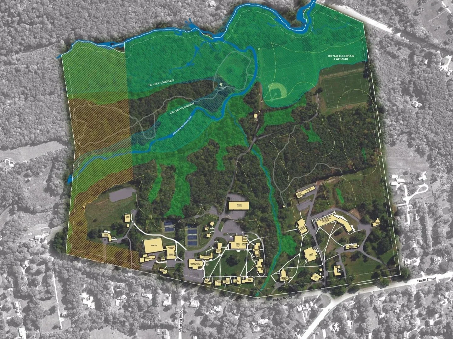 The Forman School is an independent school renowned for its use of curriculum rooted in metacognition, teaching students ways to approach learning, working, and thinking about problem-solving. Prior to engaging the campus planning team, the school had acquired some new parcels to the north, placing new pressure and amplifying adjacent conflicts with some of the programmatic uses. BDG worked with DRA architects to reorient the campus plan to establish a residential life quad, and a formal academic quad, while strengthening and enhancing pedestrian connections from campus to the forest and brook. The campus worked at the overall scale, reorienting vehicular circulation to minimize conflicts, and the smaller interpersonal scale using the landscape to mitigate sound reverberations across the existing quad,, ,build in transitions from inside to out, forming spaces through principles of prospect and refuge, and eliminating winter safety risks by pulling sidewalks away from the front faces of buildings where snowfall could be hazardous. The campus plan, emboldens the school’s connection to nature, and uses various types of landscape spaces as a refuge, a gradient from open lawn to woods, where students and facility to immerse themselves in depending on their needs. The campus plan built in transitional spaces that connected the more ordered and scripted site elements like patios and plazas towards trails and spaces overlooking streams and ponds.