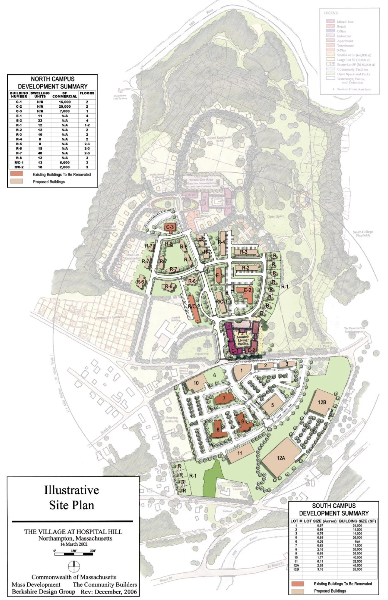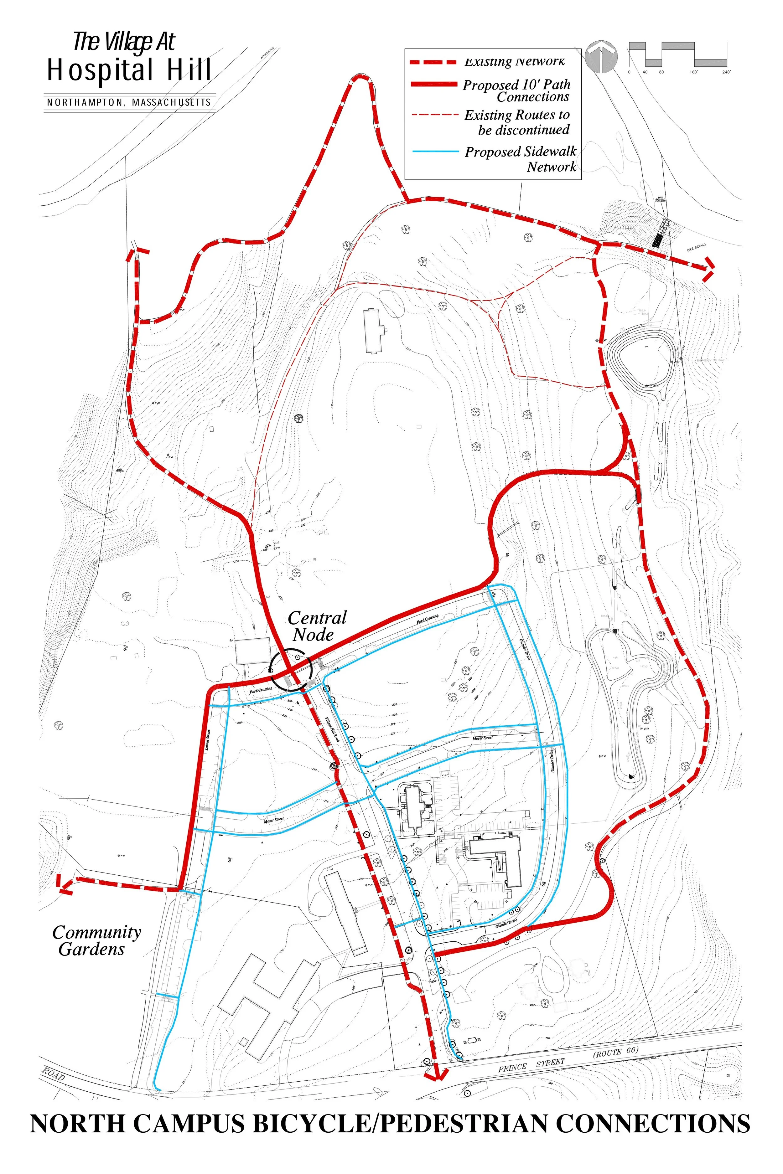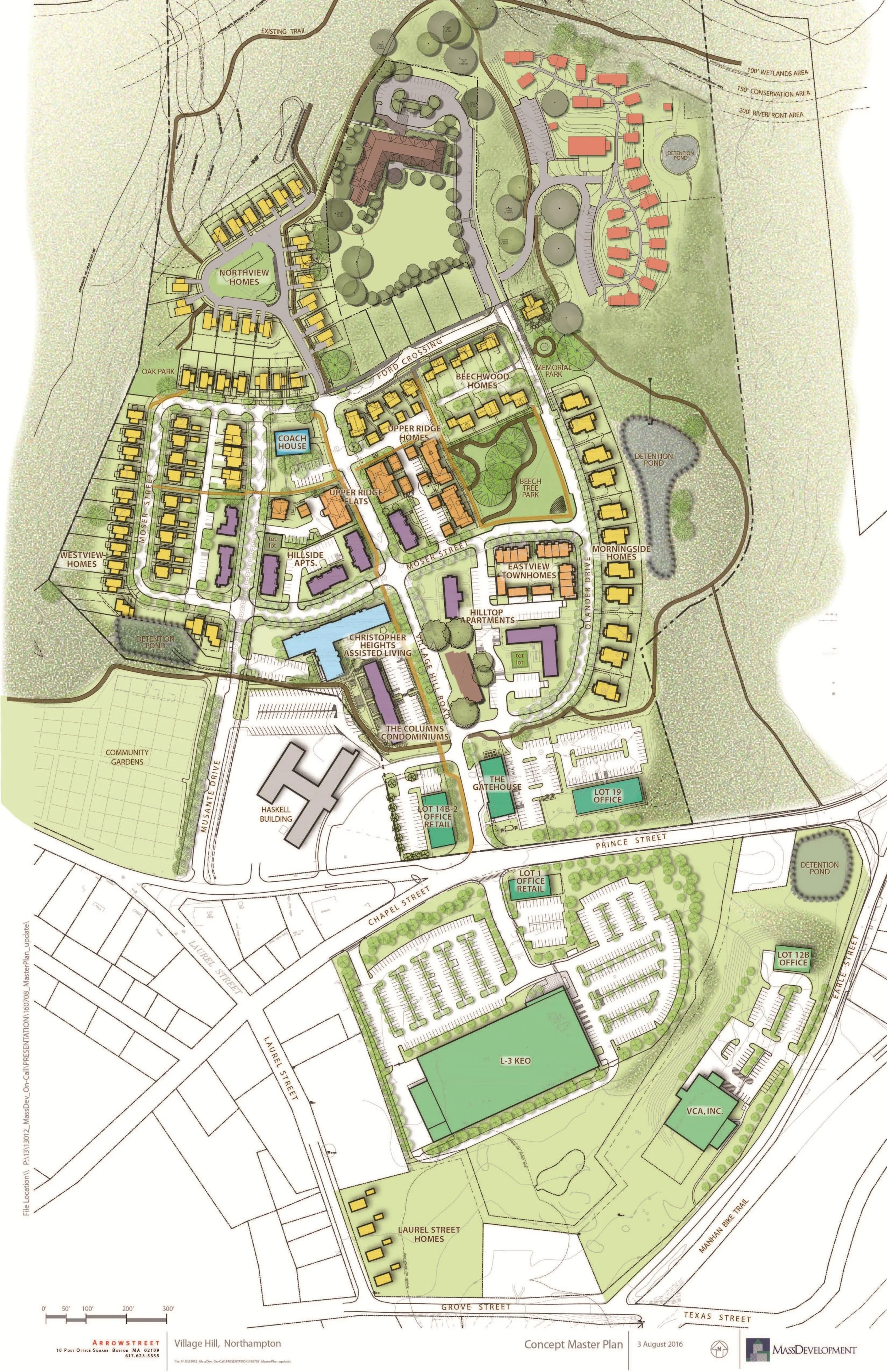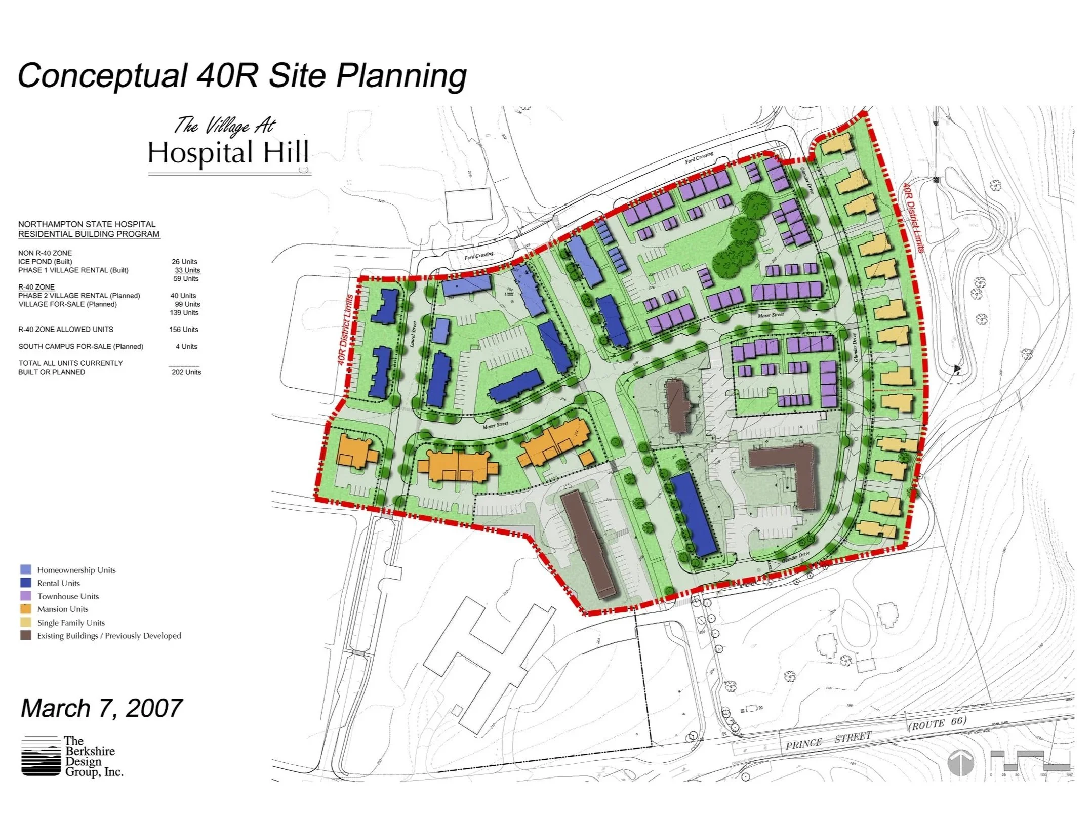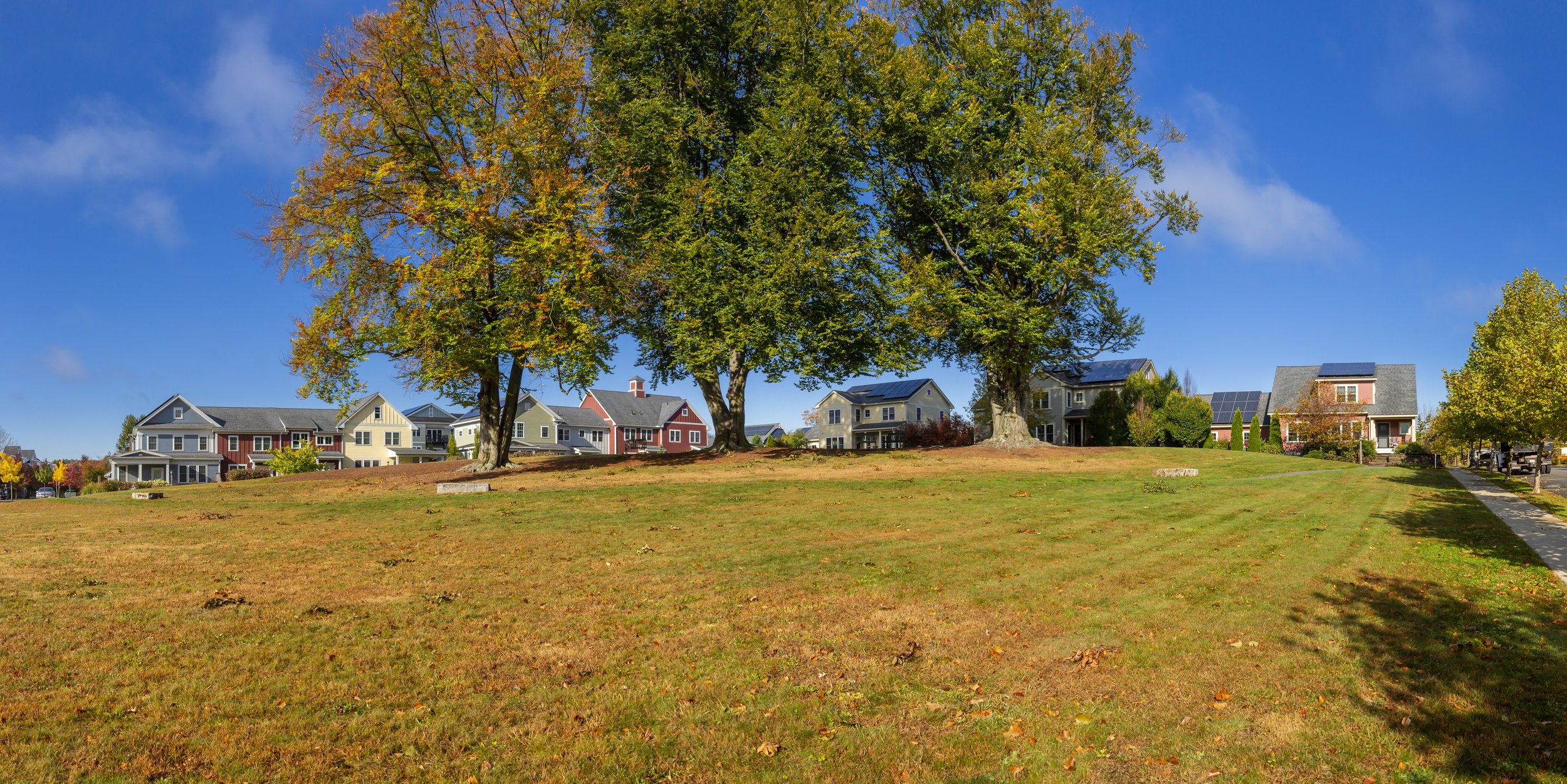 The redevelopment of the former Northampton State Hospital property has been an ongoing effort for over the past 25 years. While Berkshire Design was involved in some of the early redevelopment planning conversations with the City, our participation increased dramatically starting in 2005 when we started work on the renovation of two existing buildings for affordable housing. Since that time, Berkshire Design has continued to help advance the redevelopment of the property through multiple discrete projects with various stakeholders. These include single-family homes, a cohousing community, multi-family housing, and affordable housing projects. Berkshire Design also assisted with the layout of roadways, public open spaces, and trail systems. Together these threads of connection and concentrated development were interspersed amongst majestic old trees and rolling terrain that were preserved throughout the project. Additionally, multiple project efforts preserved historical references of what existed prior, as well as maintaining open vistas with views of the Holyoke Range. Village Hill has evolved into one of the region’s most successful neighborhood developments, with its close proximity to downtown Northampton, Smith College, community gardens, and other open space amenities like the Mill River. The neighborhood demonstrates sustainable and responsible construction while artfully navigating the transition from public space and private space through the use of landscaping and streetscape elements.