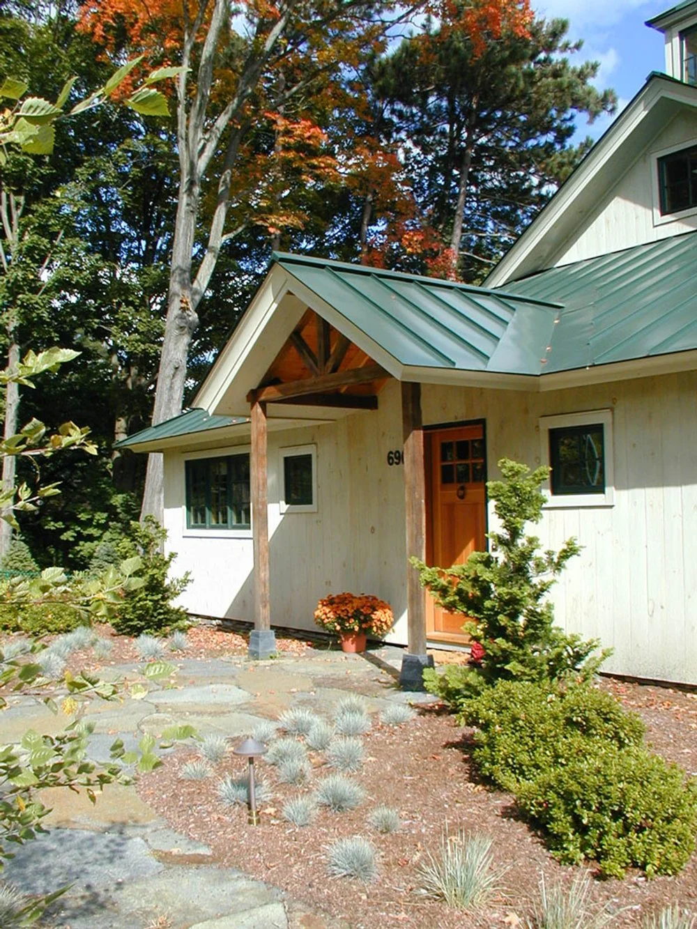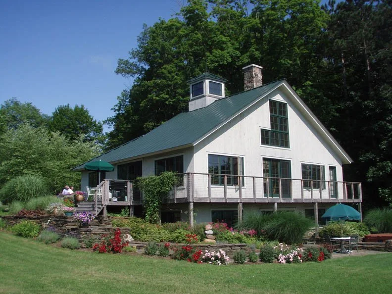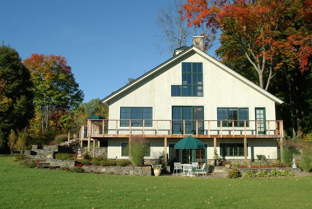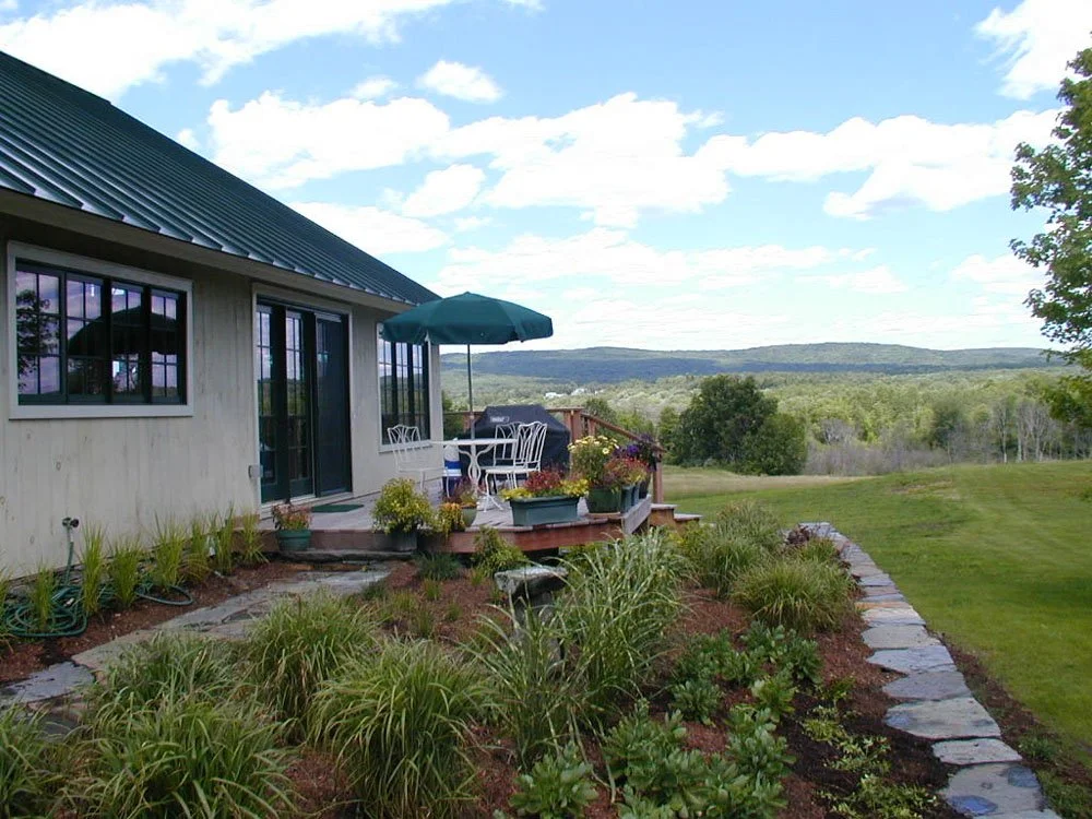 Located in Amherst, the former Well’s residence was designed by C&H Architects as a modern farmhouse built into an east-facing hillside, capturing dramatic views of the Pelham Hills. The site design features Goshen stone terraces, retaining walls, and steps that meander down the slope, linking patios and outdoor gathering spaces. At the lower floor elevation, a stone terrace opens to an expansive field and surrounding forest, visually extending the landscape beyond the property boundaries. The planting design incorporates a rich blend of textures, seasonal color, and specimen plantings that enhance both the architecture and the home’s prominent position on the hillside.
